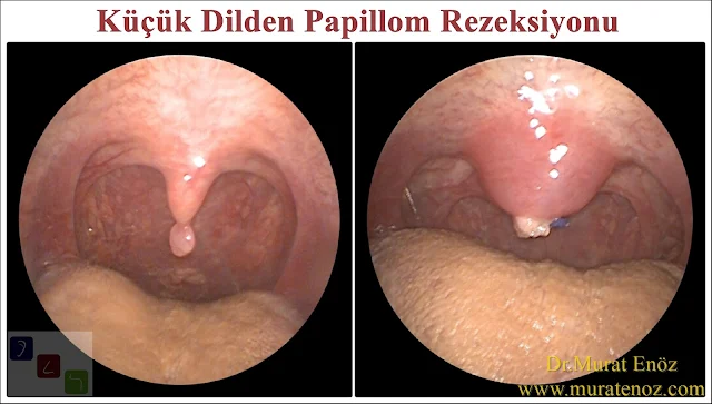 Yukarıdaki fotoğraflarda da görülen, küçük dilden kaynaklanmış, ince mukozal sap ile küçük diline bağlı, aşağıda dil köküne temas eden, yaklaşık 5-6 mm çapında papilloma bağlı olarak öksürük, boğazda takılma hissi haricinde başka bir belirti ortaya çıkmamış, hasta tarafından görülerek farkedilmiş.